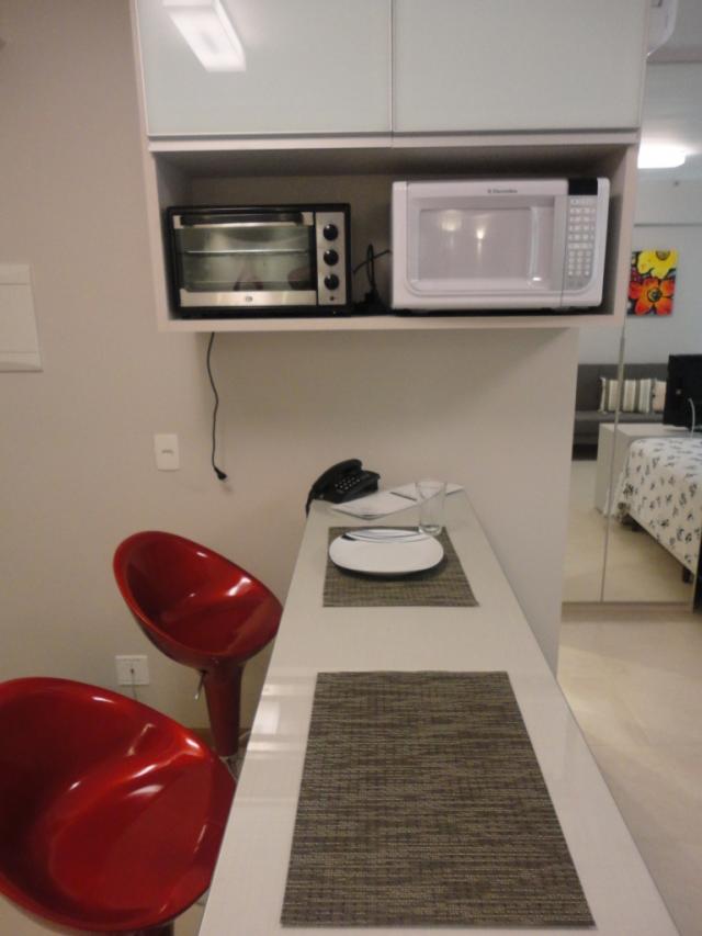 Cozinha completa, montada com armários, fogão, frigobar, forno elétrico, forno microondas, bancada para refeições e utensílios de cozinha;