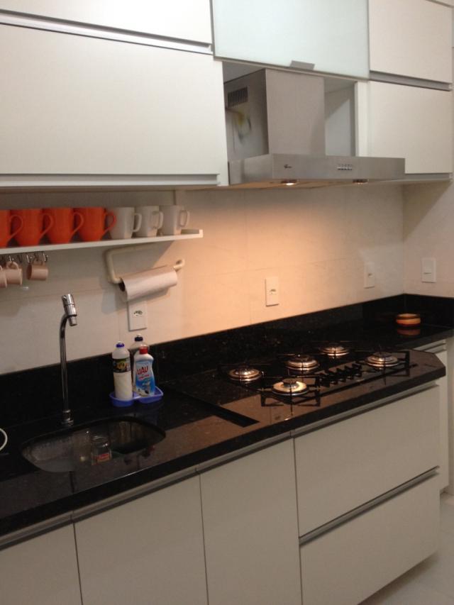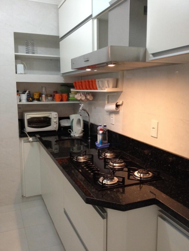 . Cozinha planejada, de muito bom gosto, com bancada em granito preto, armários sob medida, coifa exaustora em aço escovado, fogão de bancada (coocktop – 5 bocas) e bancada para refeições rápidas