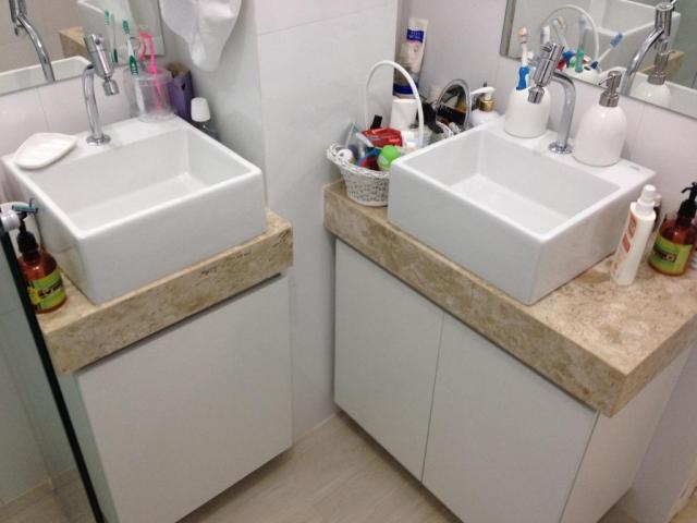 . Banheiro da suíte com 2 pias suspensas, bancada em mármore, armários planejados e box blindex