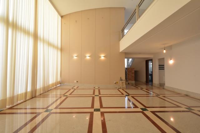 . Elegante hall de entrada, com porta pivotante, pé direito duplo e escadas em granito