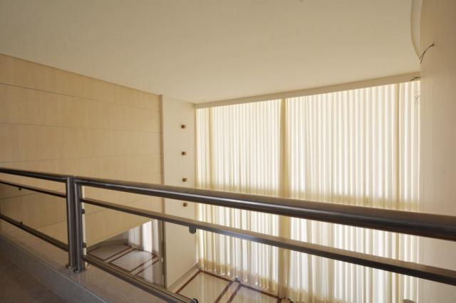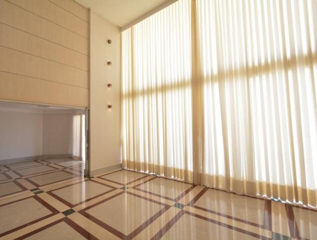 . Sala com pé direito duplo, vitral e cortinas